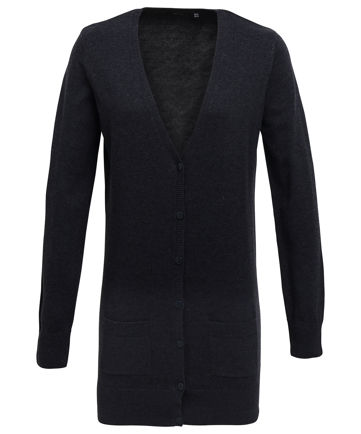 Long length cardigan with cotton rich yarn for a soft feel. Fine gauge knit. Five self-coloured buttons. Two front patch pockets. Ribbed knit v-neck, cuffs and hem.