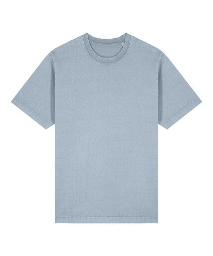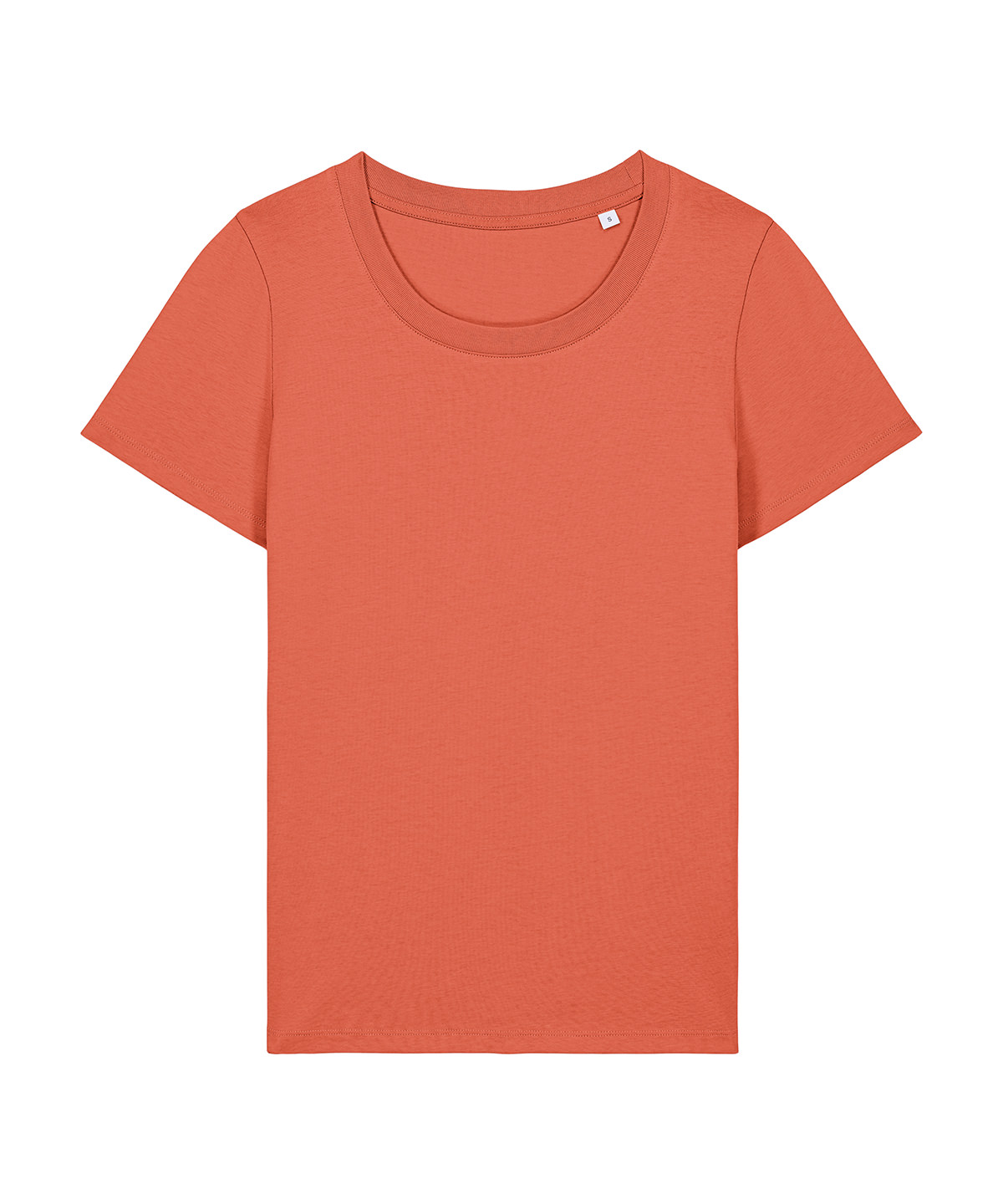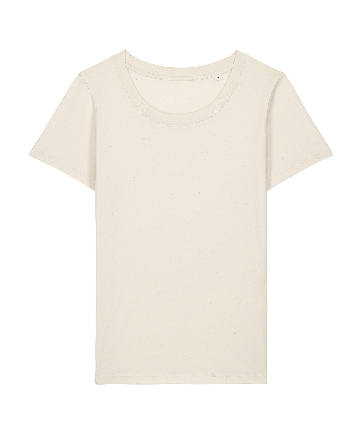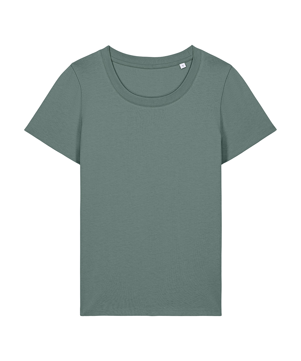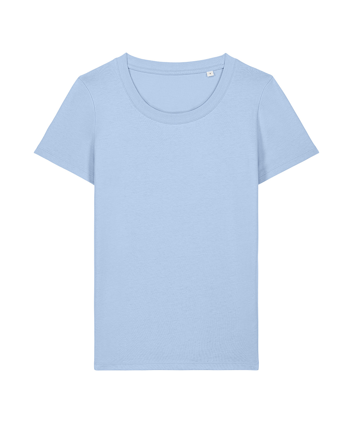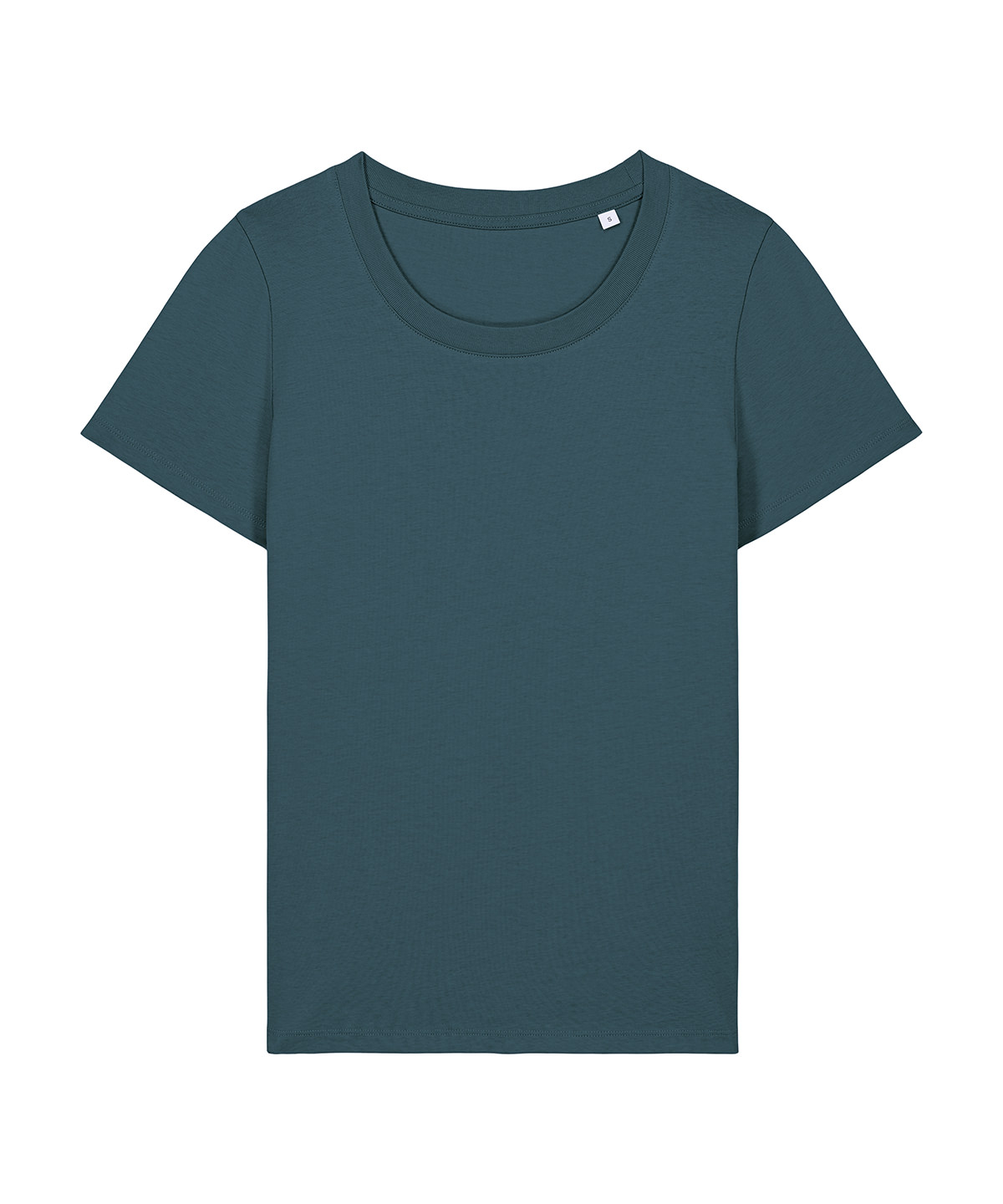 Iconic mid-light womens t-shirt. Fitted. Set-in sleeve. 1×1 rib at neck collar. Inside back neck tape in self-fabric. Narrow twin-needle topstitch at sleeve cuff and hem.